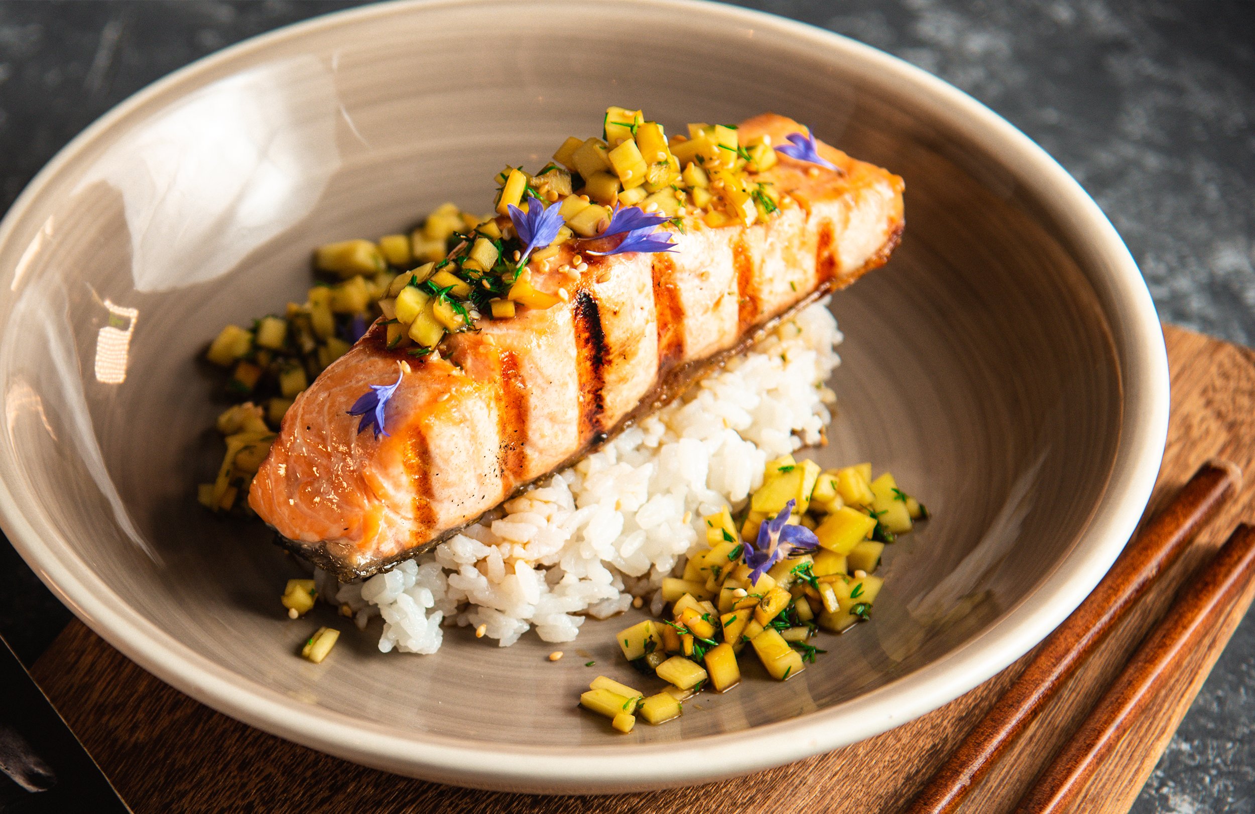 Filete de salmón a la parrilla con vinagreta de mango y cilantro, acompañado de arroz de sushi.